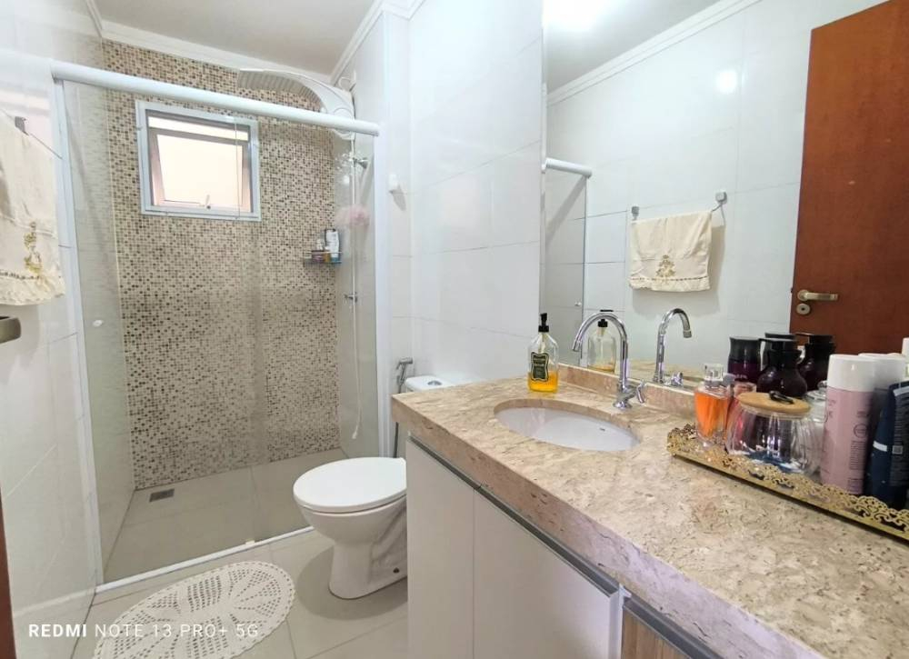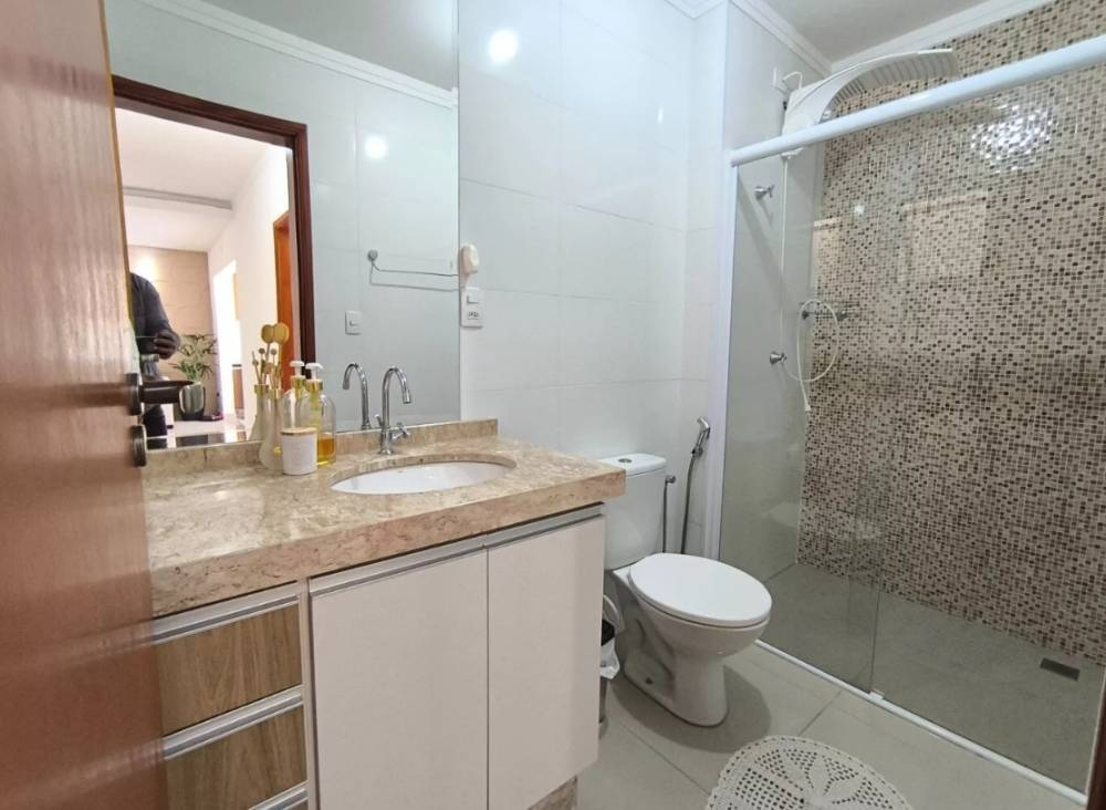 (01) Um Banheiro social com box ,ducha,armários planejados e pia com mármore travertino;