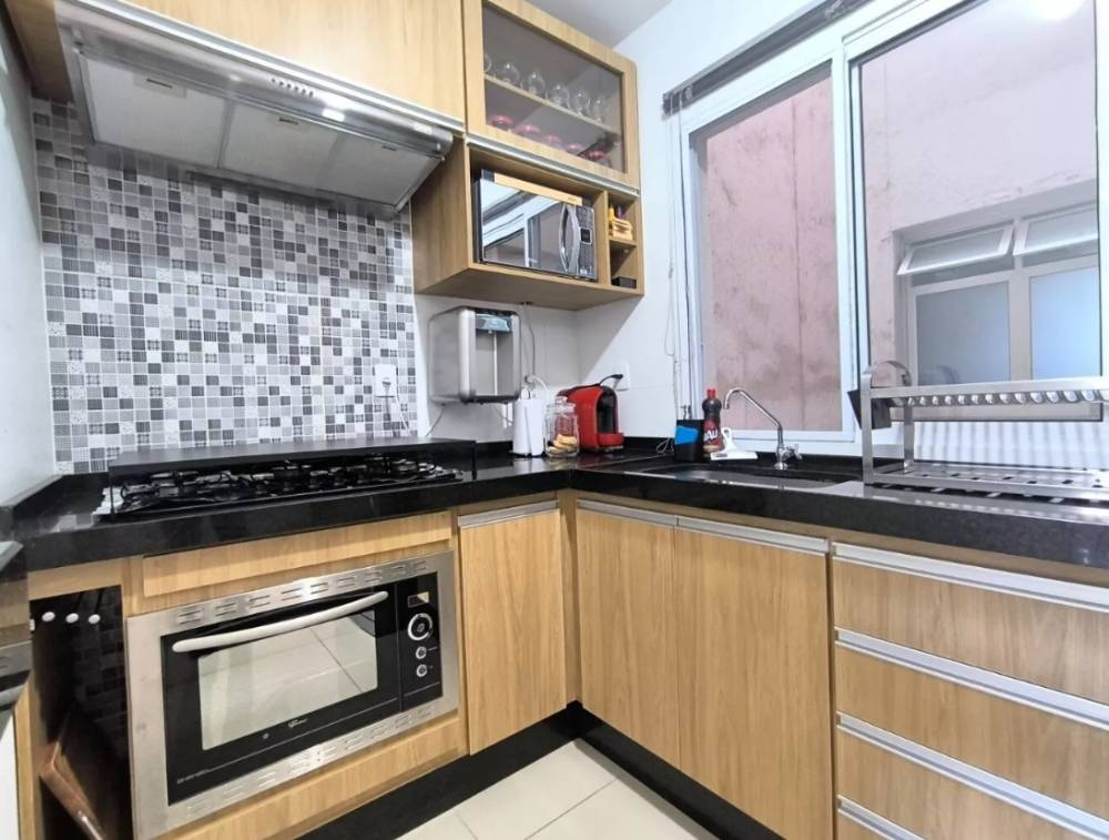 Cozinha com balcão e bancada em granito , equipada com fogão, forno e depurador de ar;